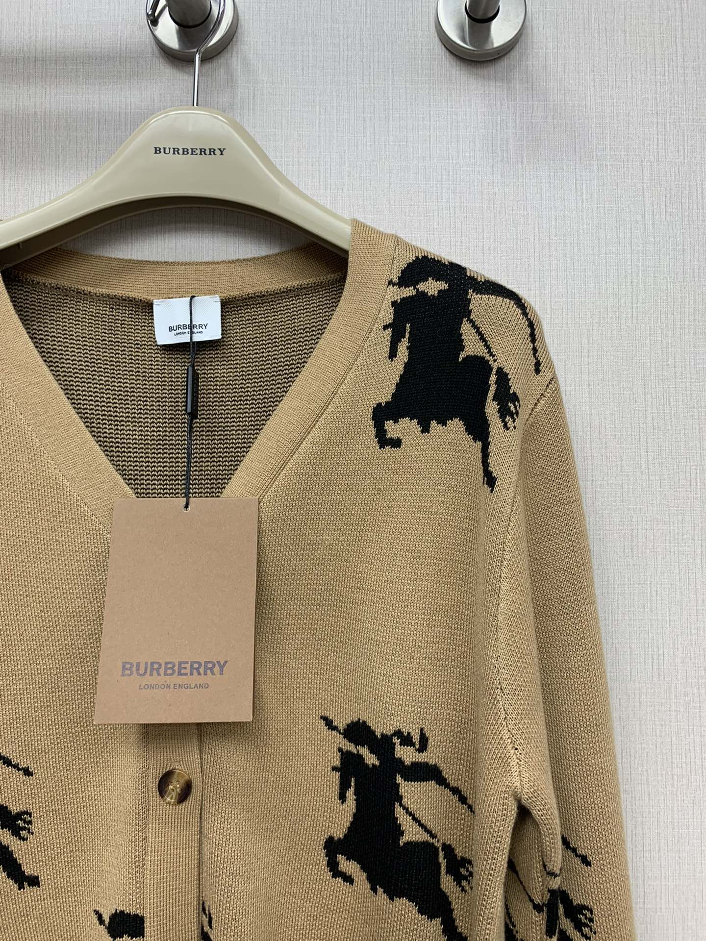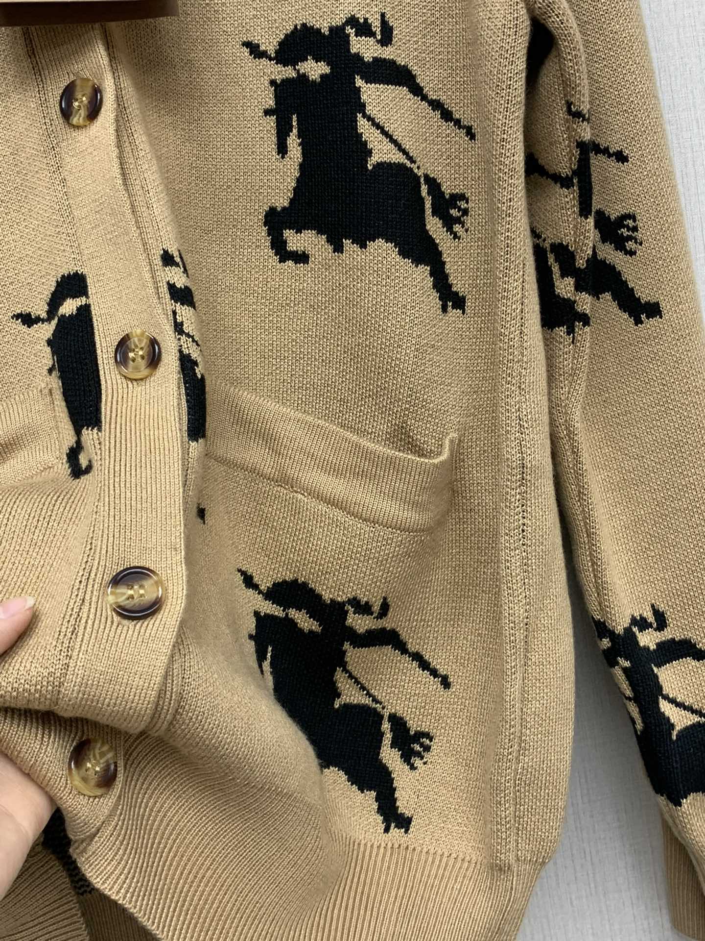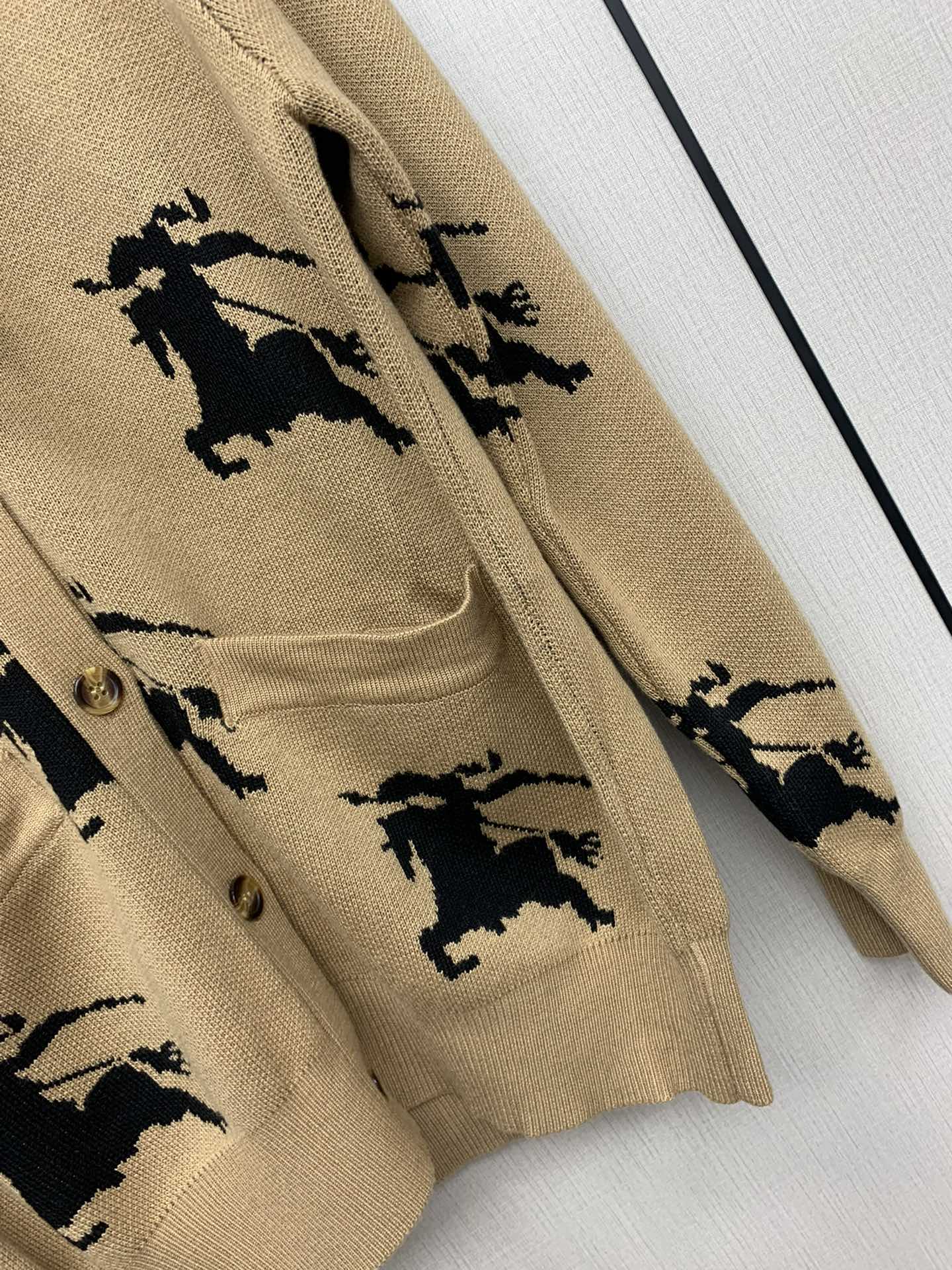 Tags: Cardigan Beige Femme Luxe, Cardigan Laine Femme Burberry, Maille Laine Confortable, Mode Rétro Élégante, Motifs Équestres Burberry, Vêtement Femme Hiver
