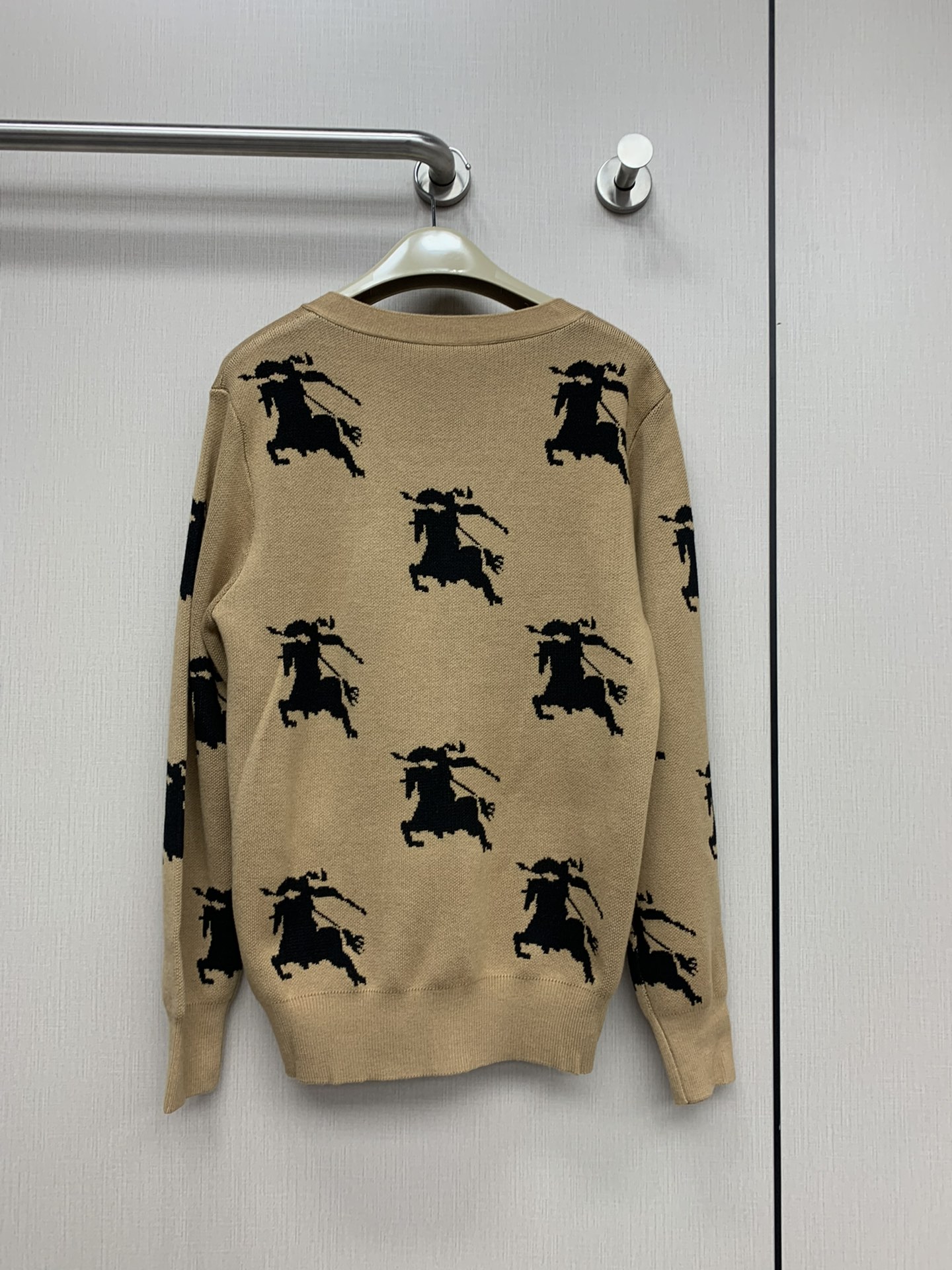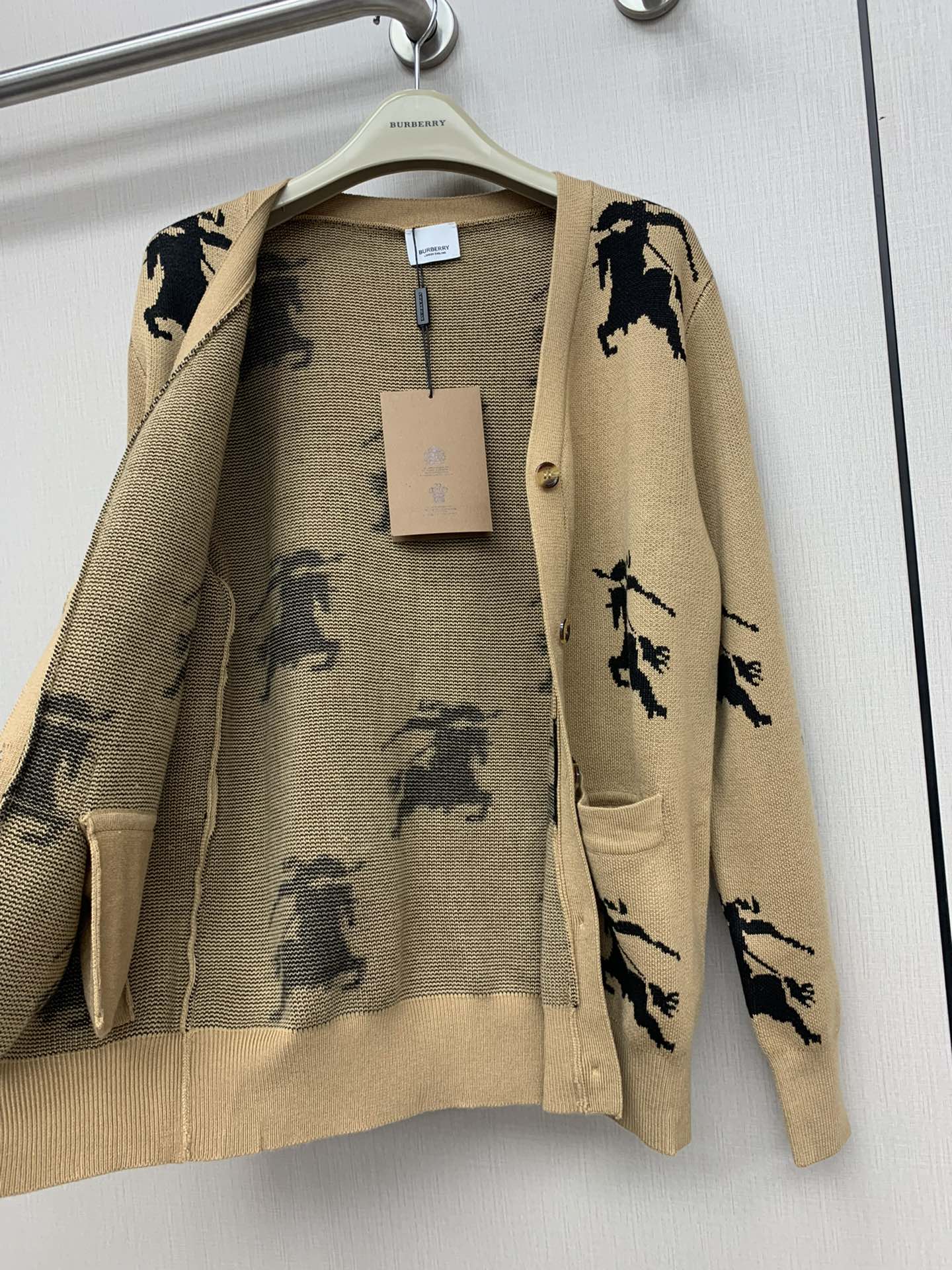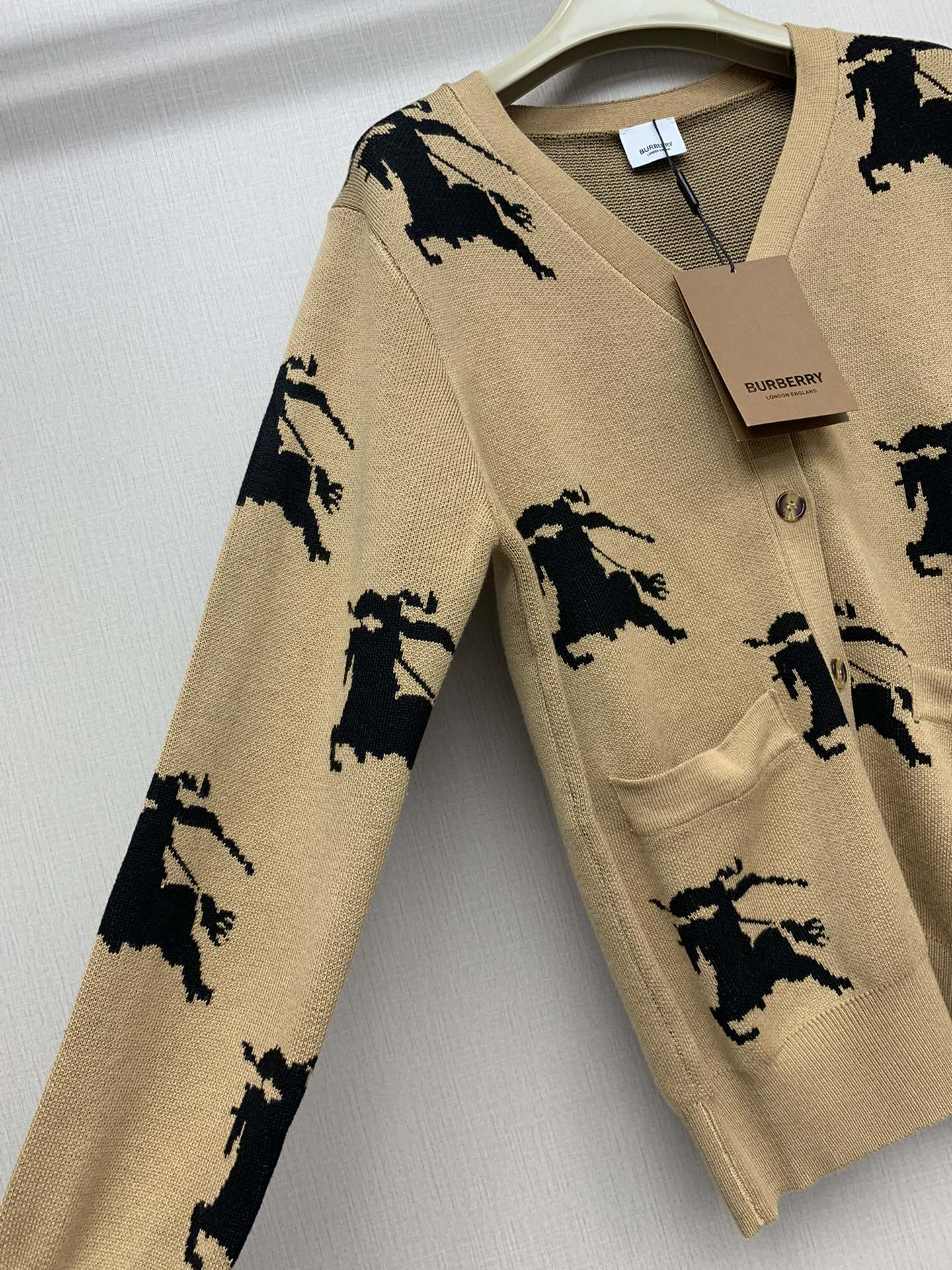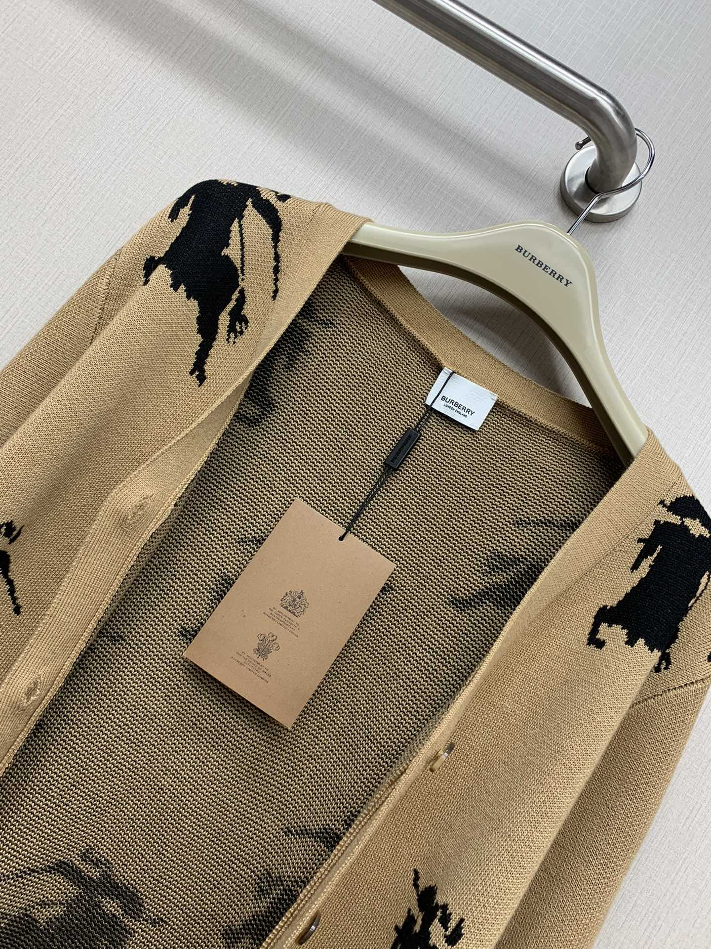 Tags: Cardigan Beige Femme Luxe, Cardigan Laine Femme Burberry, Maille Laine Confortable, Mode Rétro Élégante, Motifs Équestres Burberry, Vêtement Femme Hiver