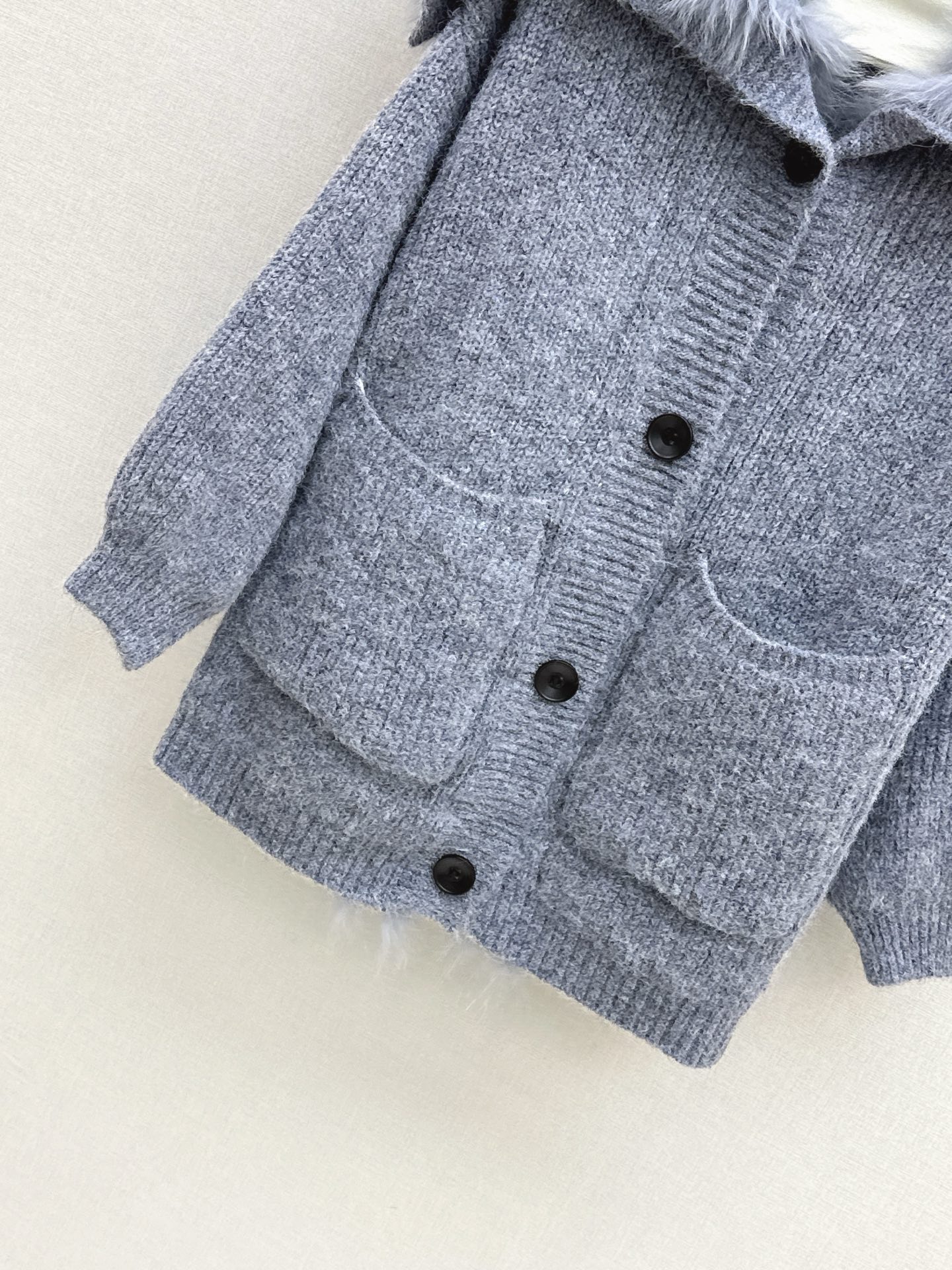 Ce cardigan mi-long combine la chaleur de la maille avec l'élégance d'un col en fourrure de renard, offrant un style unique pour la saison automne-hiver.