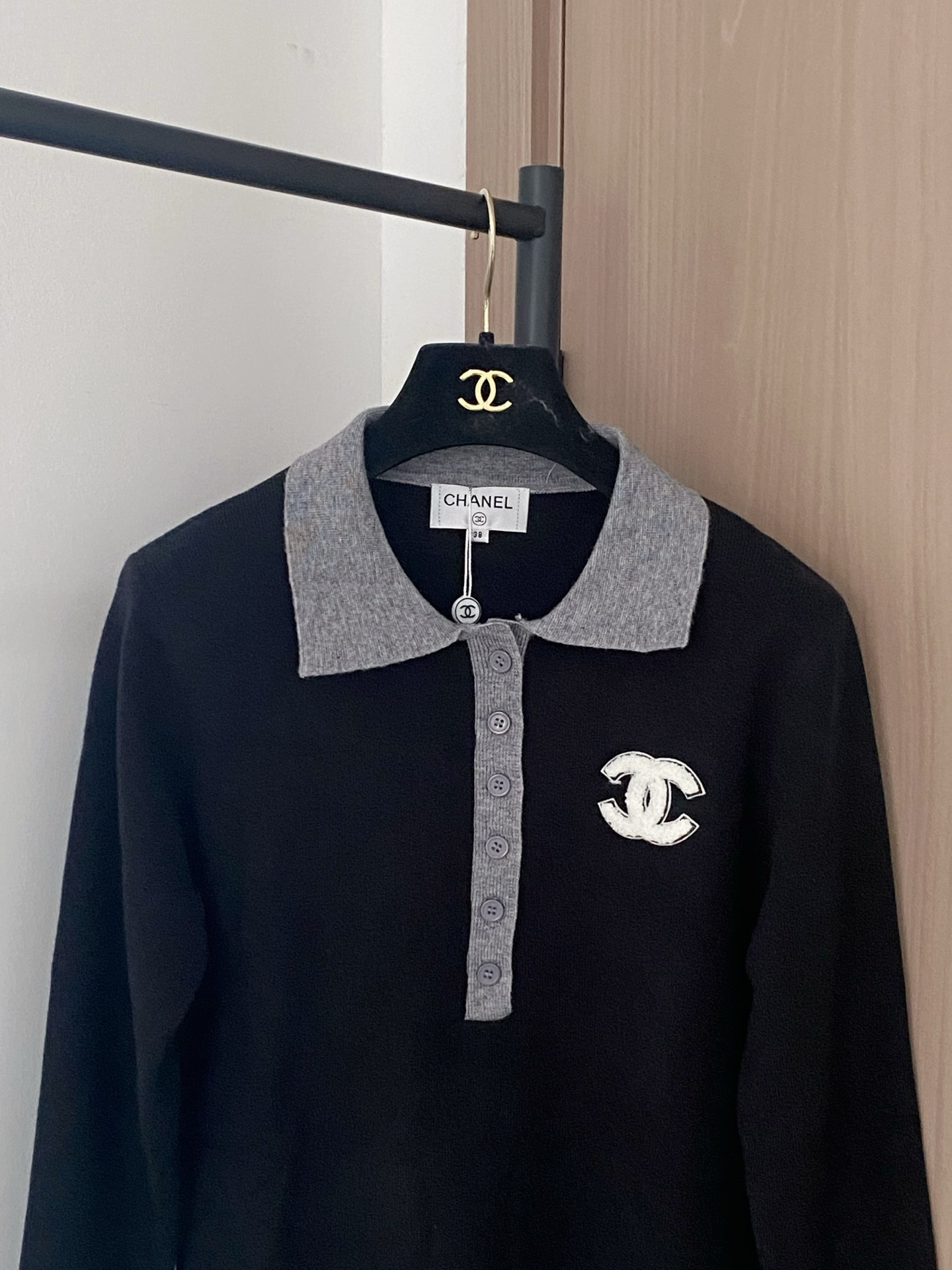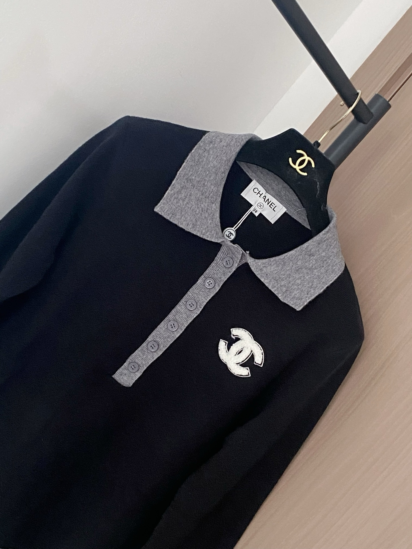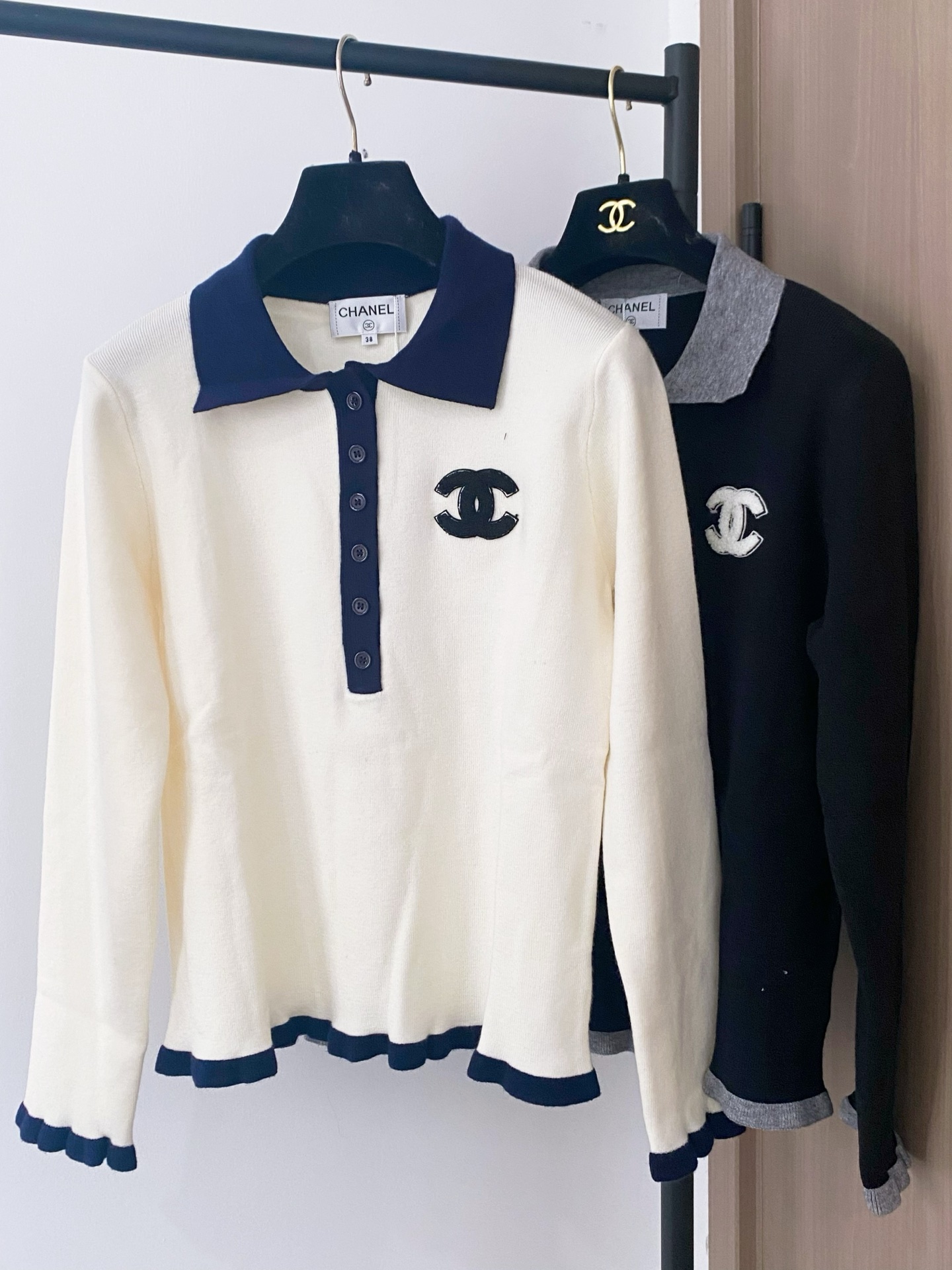 Tags: Manches Longues Logo Chanel, Polo Bicolore Design, Polo Chanel Femme, Polo Respirant Marque, Vêtement de Luxe Femme