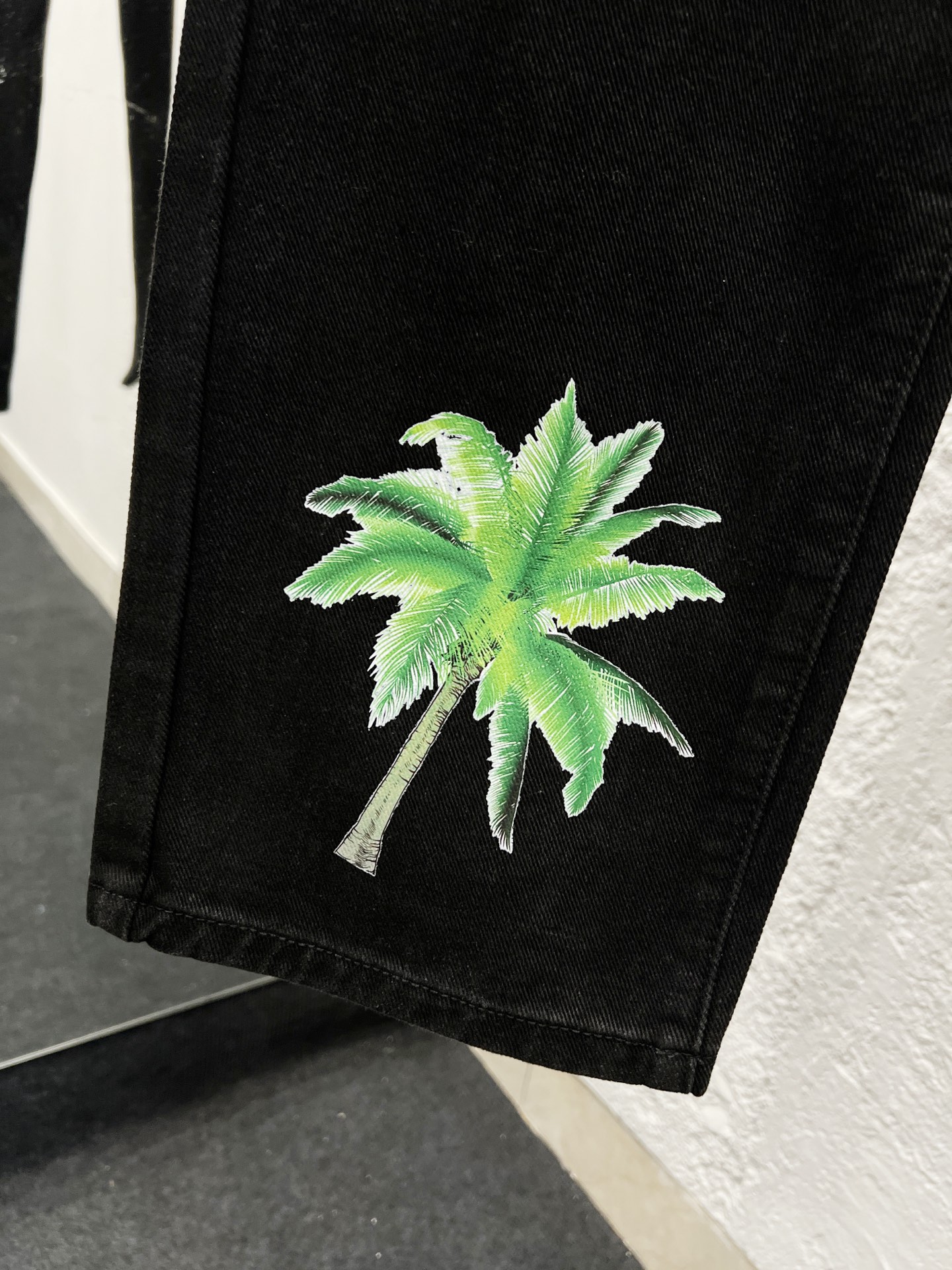 Jeans Louis Vuitton SS25 en coton lavé avec un imprimé arbre de cocotier pour un look décontracté et tendance.