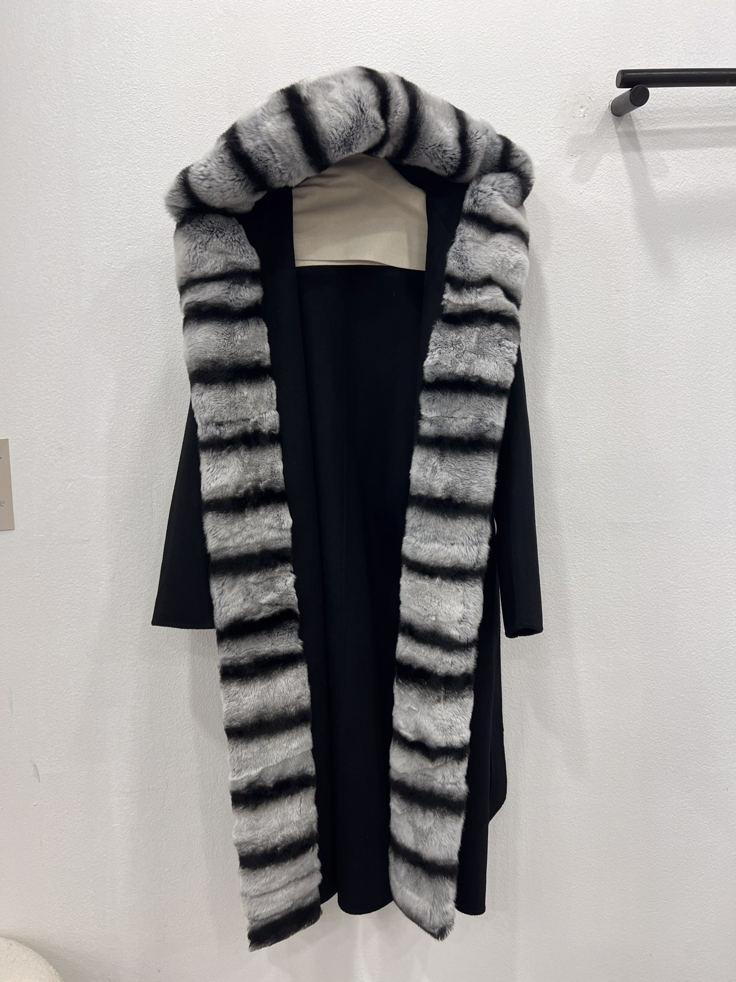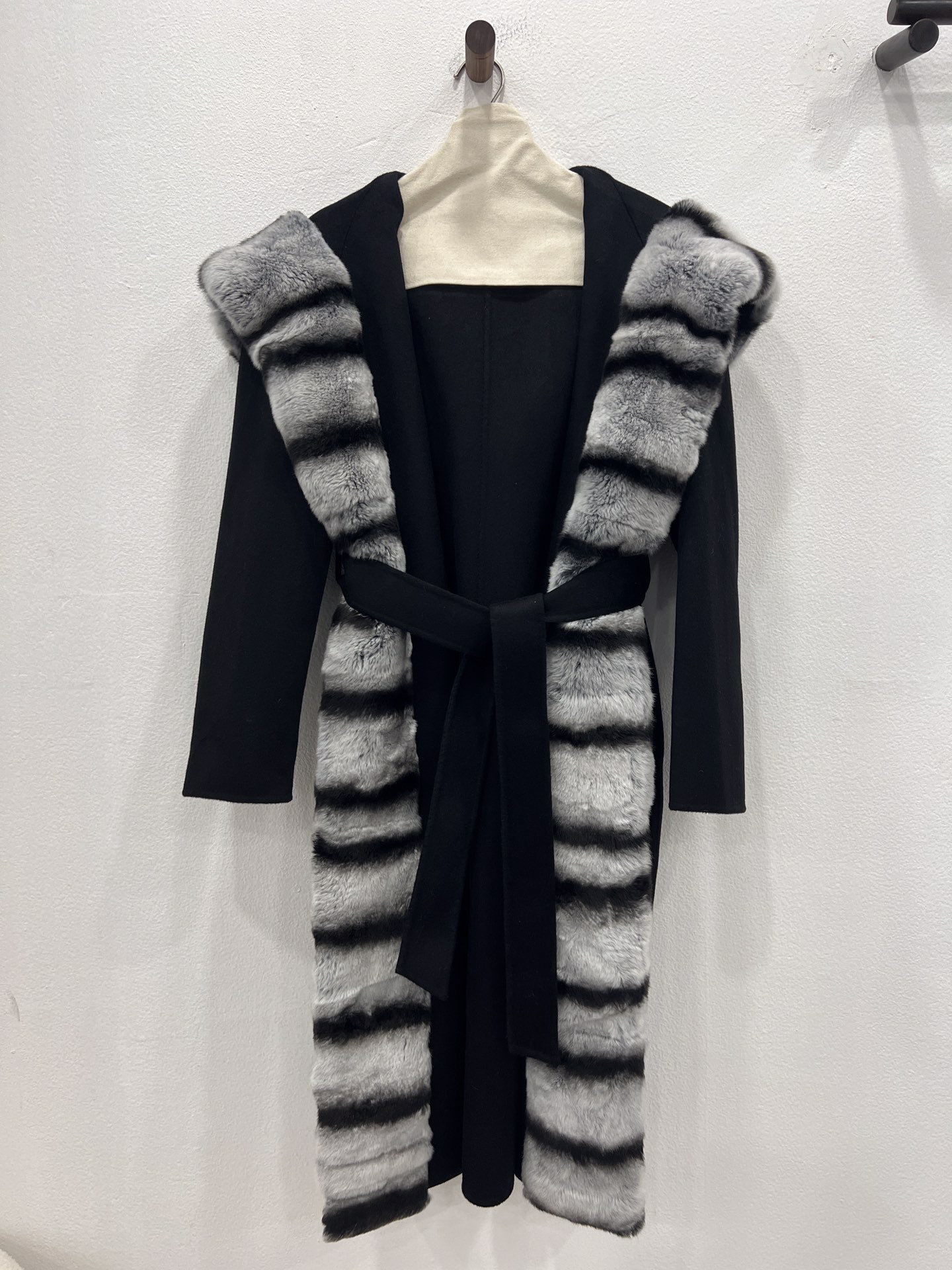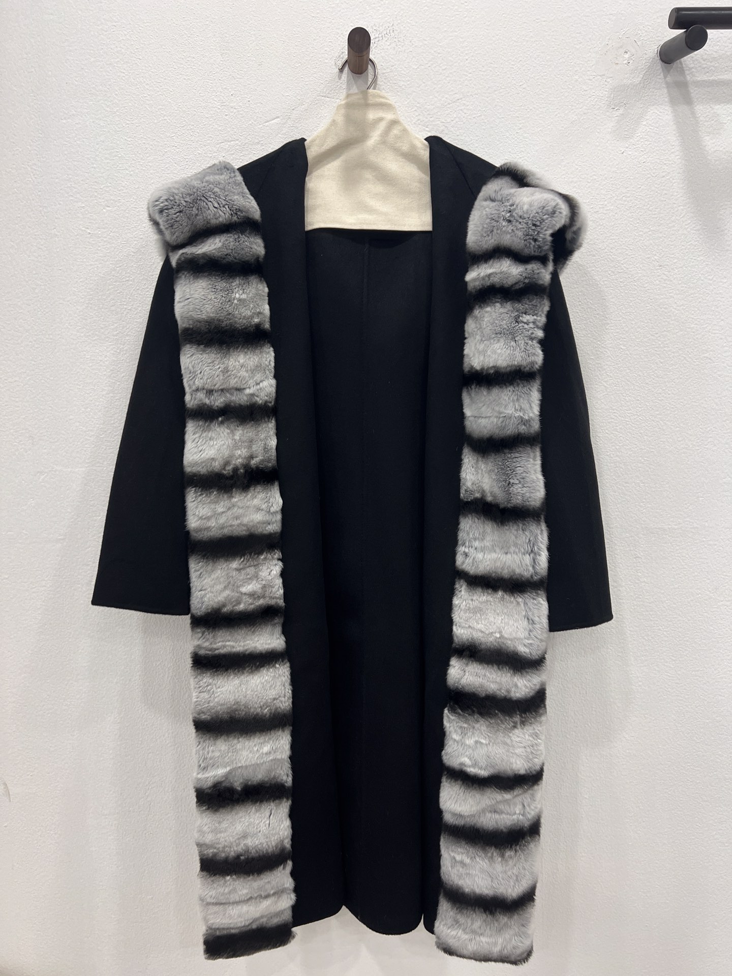 Élégance et chaleur combinées dans ce manteau Loro Piana en laine douce et orné de fourrure de lapin rex. Capuche doublée pour un confort optimal.