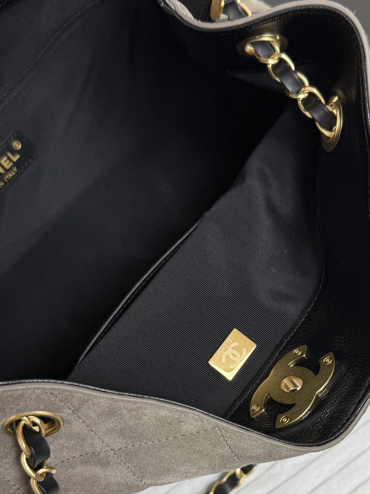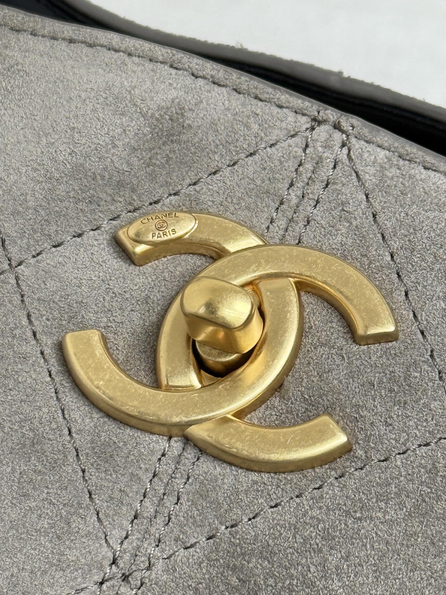 Découvrez le sac Chanel 25A, un design élégant en daim et cuir. Porté épaule, croisé ou à la main, il est parfait pour toutes occasions.