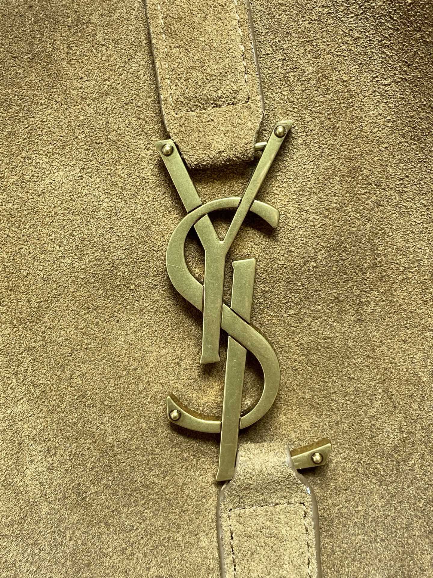 Découvrez le sac cabas Yves Saint Laurent, un modèle en daim caramel avec fermeture en cuir, parfait pour un look décontracté.